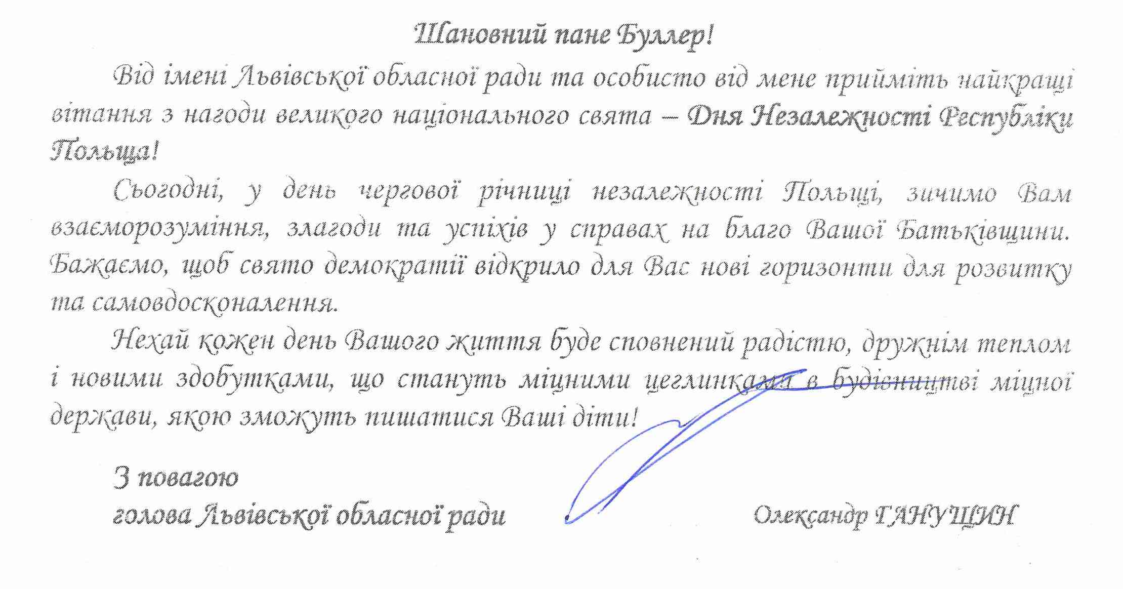 Życzenia dla CPE od Lwowskiej Rady Obwodowej z okazji Narodowego Święta Niepodległości