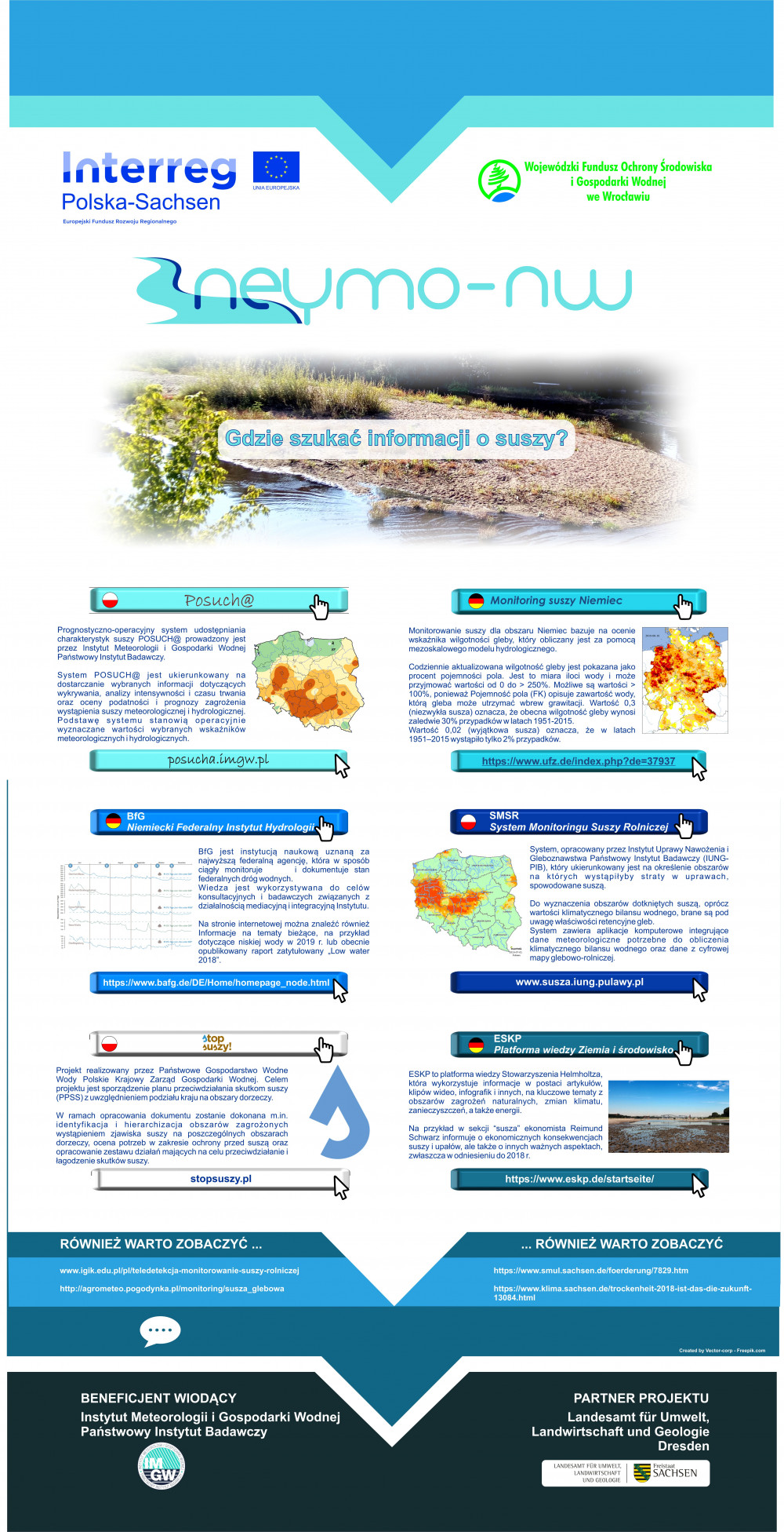 Nysa Łużycka – rzeka graniczna łącząca Polskę, Niemcy i Czechy. W związku z nasilającymi się w ostatnich latach okresami suszy i występowaniem niskich stanów wody obniża się dostępność zasobów wodnych. By lepiej wykorzystywać te dostępne, w ramach projektu NEYMO-NW wypracowane zostało wspólne podejście oceny niskich wód. Jest ono punktem wyjścia dla przeprowadzenia procesów modelowania zasobów wodnych oraz źródłem wiedzy, która zasila Transgraniczne Centrum Informacji o zasobach wodnych (TWCIW). Projekt NEYMO-NW to nie tylko zdobywanie informacji i pomoc dla ekspertów, to także proekologiczne działania edukacyjne, m.in. wystawy objazdowa, prelekcje.