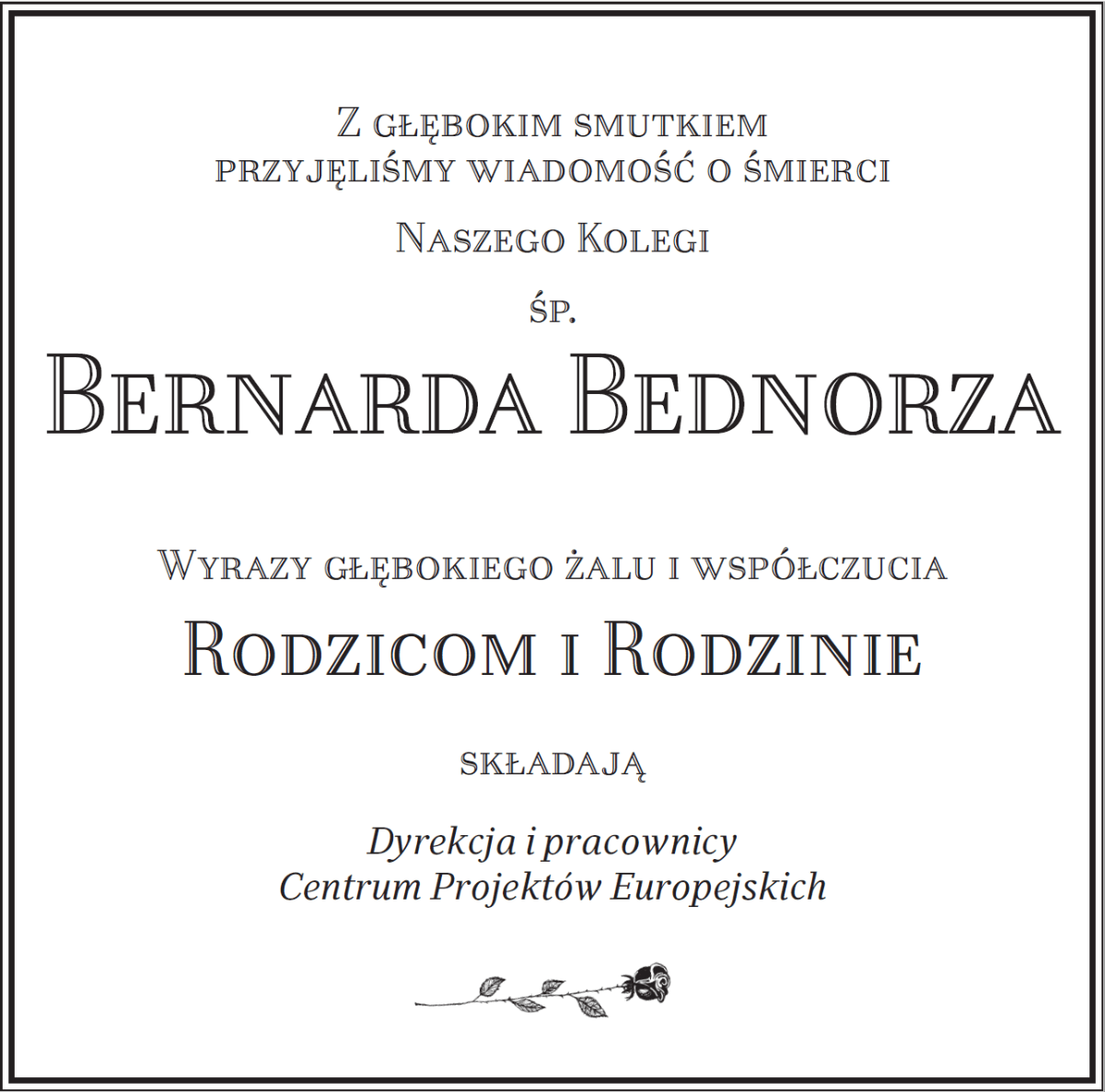 Z głębokim smutkiem przyjeliśmy wiadomość o śmierci Naszego Kolegi Śp. Bernarda Bednorza. Wyrazy głębokiego żalu i współczucia Rodzicom i Rodzinie składają Dyrekcja i pracownicy Centrum Projektów Europejskich.