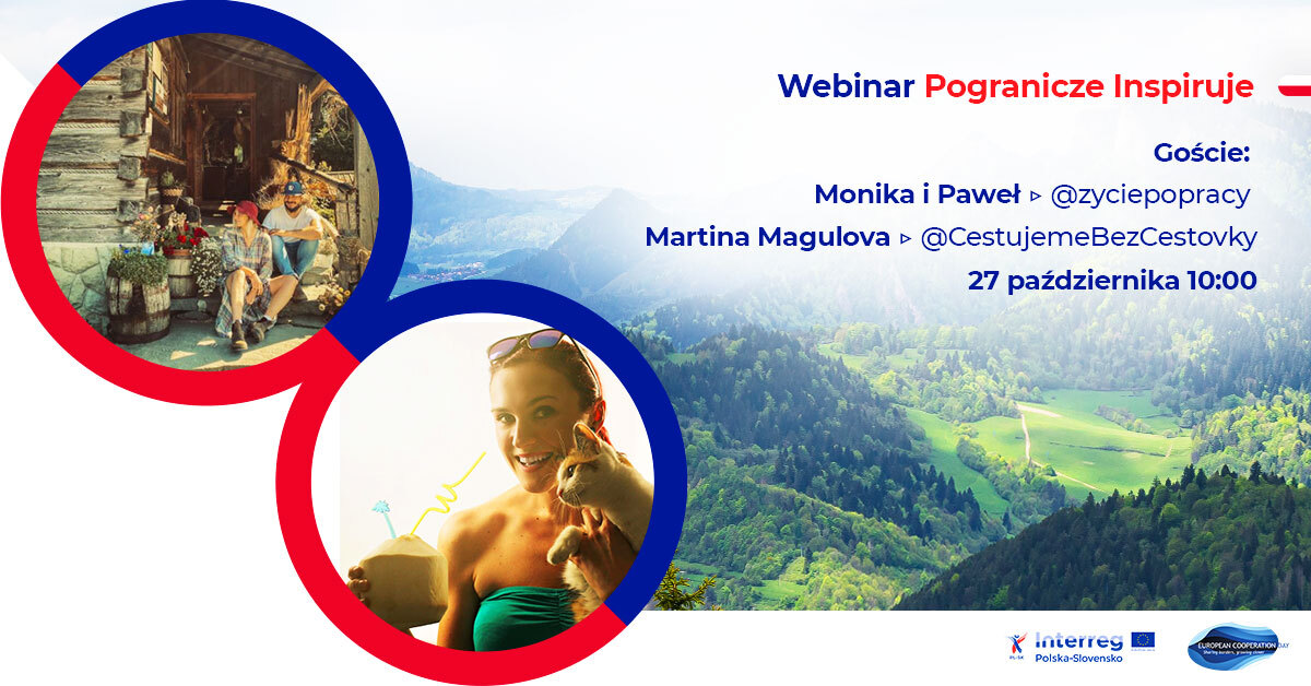 W ramach wydarzenia rocznego programu Interreg Polska-Słowacja, zapraszamy państwa na webinar #pograniczeinspiruje z udziałem influencerów- Moniki i Pawła z @zyciepopracy oraz Martiny Magulovej z @cestujemebezcestovky.