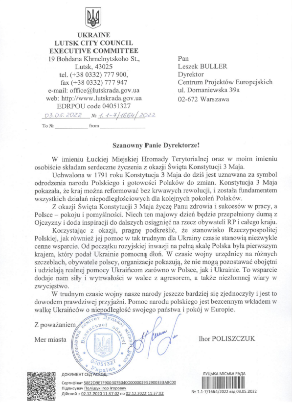 Życzenia od Mera miasta Łuck z okazji Święta Konstytucji 3 Maja